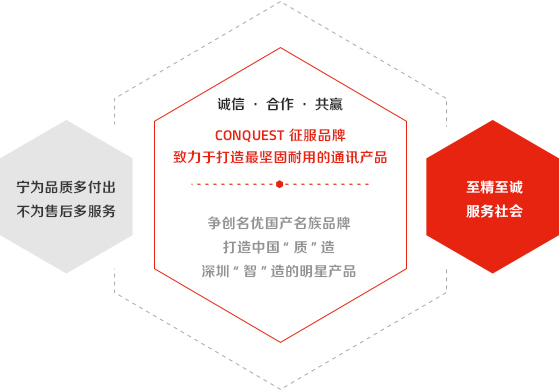深耕行業(yè)數(shù)年,CONQUEST征服始終秉承以客戶需求為核心,追求多元化經(jīng)營模式;遵循“寧為品質(zhì)多付出、不為售后多服務(wù)”的品質(zhì)理念;“配置躍然升級,征服永不止步”的產(chǎn)品理念;貫徹“致力應(yīng)急 專于通信 服務(wù)至上 互利共贏”的企業(yè)宗旨;“用征服,征服一切不服”的企業(yè)精神,致力于打造堅固耐用的三防智能通訊產(chǎn)品和中國“質(zhì)”造、深圳“智”造的明星產(chǎn)品。