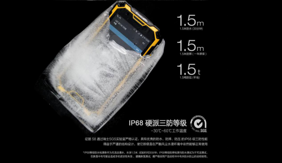 CONQUEST征服S8,炫酷機身,高亮IPS液晶屏,表面硬度高達9H,玻璃蓋采用美國康寧大猩猩4代防爆玻璃蓋板,讓其具備優(yōu)秀的三防性能,使它在極寒的惡劣環(huán)境下依然能夠正常使用,CONQUEST征服S8通過瑞士SGS實驗室嚴格認證,并取得IP68級三防等級證書,具備1.5米防水泡、1.5米防摔、99.9%防塵等三防特性,以這樣的專業(yè)品質(zhì)被《流浪地球》選中并出鏡。