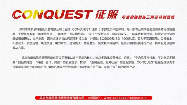 康凱思特專注于做戶外三防智能對(duì)講手機(jī),本著工匠精神,對(duì)產(chǎn)品精準(zhǔn)到位,在制造工藝、工序上不斷優(yōu)化,精心打造,確保做出的產(chǎn)品不僅是優(yōu)質(zhì)產(chǎn)品,更是經(jīng)典產(chǎn)品,全力打造中國(guó)“質(zhì)”造、深圳“智”造!從硬件到軟件有完整的應(yīng)用和解決方案,可針對(duì)機(jī)場(chǎng)鐵路交通運(yùn)輸、林業(yè)漁業(yè)、電力水力、石油化工煤礦防爆等市場(chǎng)進(jìn)行定制,實(shí)現(xiàn)與用戶的互動(dòng)和滿足各種消費(fèi)者的個(gè)性化需求。