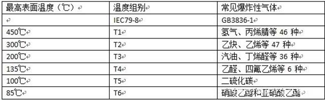 爆炸性氣體混合物的引燃溫度是能被點(diǎn)燃的溫度極限值。電氣設(shè)備按其最高表面溫度分為T(mén)1~T6組,使得對(duì)應(yīng)的T1~T6組的電氣設(shè)備的最高表面溫度不能超過(guò)對(duì)應(yīng)的溫度組別的允許值。溫度組別、設(shè)備表面溫度和可燃性氣體或蒸氣的引燃溫度之間的關(guān)系如下表所示。