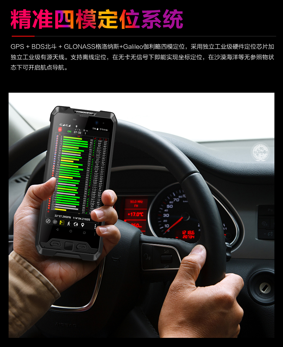 ▲CONQUEST征服S19則擁有強大的四模高精度定位 (可定制RTK RTD UWB 北斗短報文),四模定位加持的同時還有SOS求救,只為更好
