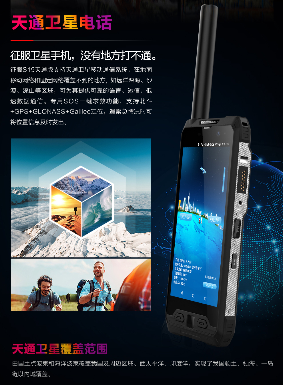 ▲CONQUEST征服S19 支持天通衛(wèi)星電話,在城市公網(wǎng)環(huán)境中可以作為普通智能手機使用,在通信網(wǎng)絡覆蓋不到或不穩(wěn)定區(qū)域時則可以開啟