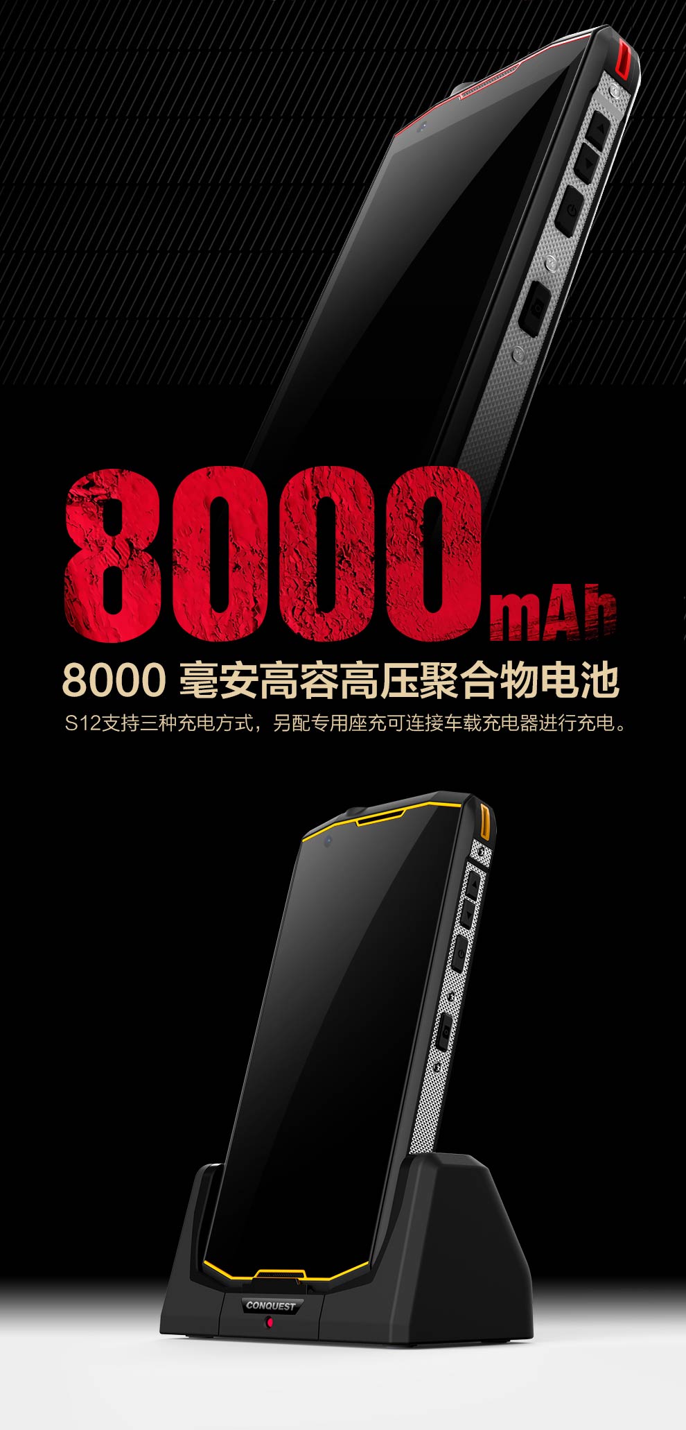 在這款手機身上,征服(CONQUEST)S12也發(fā)揮了自己的專長:續(xù)航能力。征服(CONQUEST)S12配備了一塊8000mAh大容量電池,這在目前的手機市場上可不多見。如果你對手機續(xù)航有著很高的要求,那這款手機的表現(xiàn)絕對能讓你滿意。