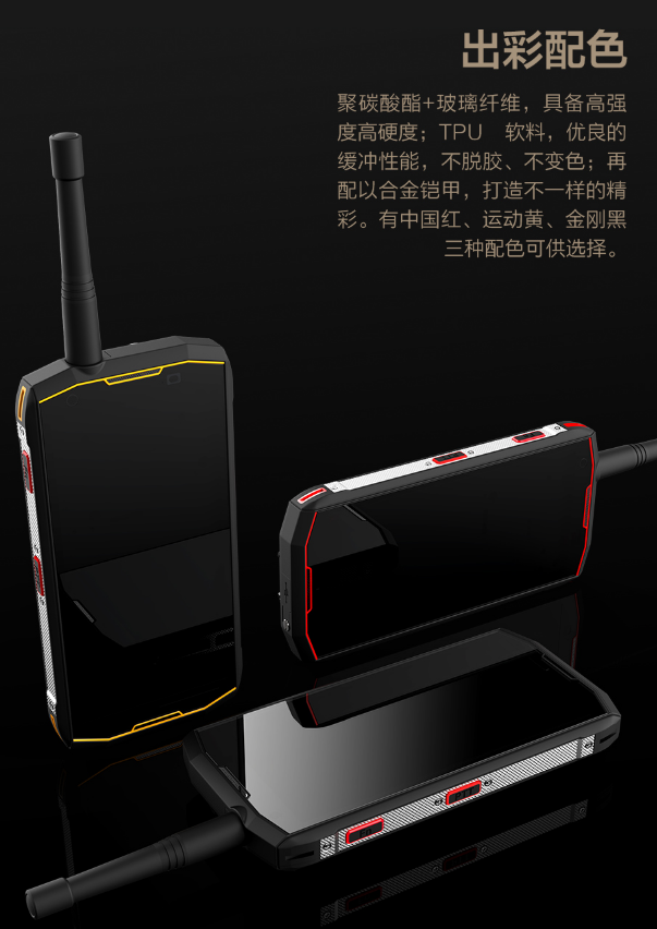 紅色、黃色、黑色三種顏色可選, 雖然相比普通的智能手機稍顯厚重,但是相較于一般的三防手機也已經(jīng)進(jìn)步太多了。流暢的線條將科技感勾勒出來, 軟硬膠清晰分辨,柔軟的軟膠,觸感給人帶來舒適的感覺 ;冰冷的硬膠,給你全方位保護, 也給給人一種安全感。