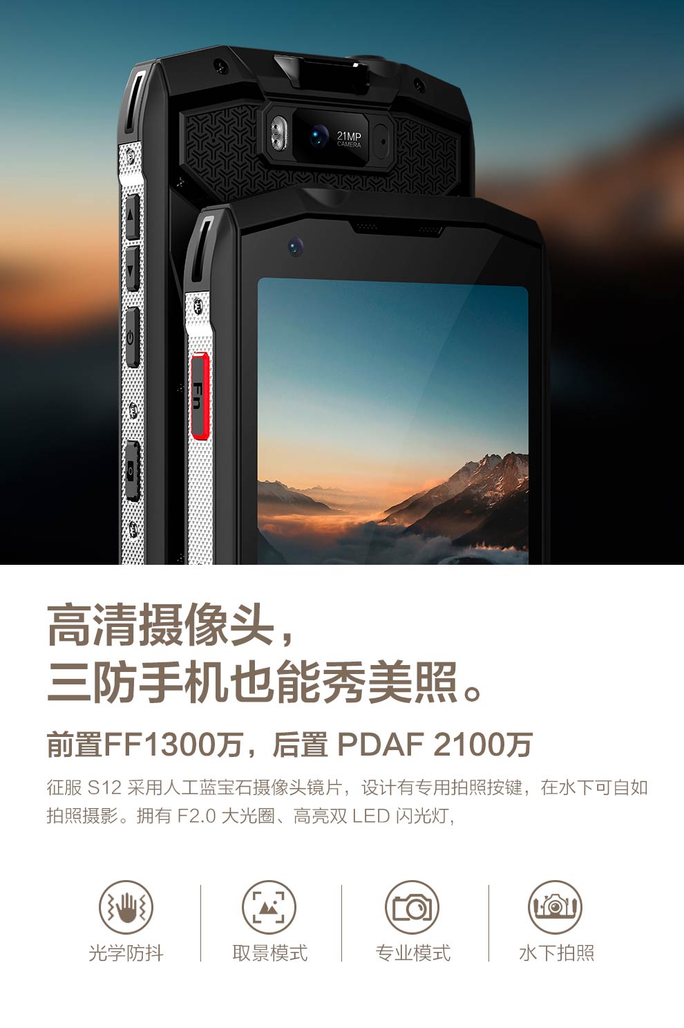 再者我們就說說怎么記錄戶外的美好時(shí)光。征服(CONQUEST)S12作為一臺(tái)三防智能手機(jī),當(dāng)然就擁有理想的攝像頭。它的后置是擁有2100萬(wàn)像素的攝像頭。無(wú)論是拍照還是錄視頻都非常的清晰。記錄戶外活動(dòng),征服(CONQUEST)S12乃不二之選。