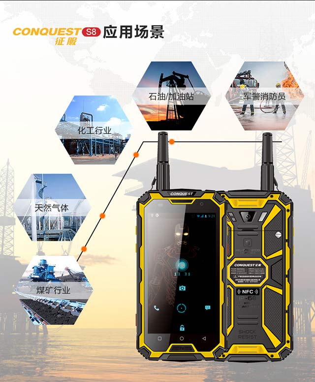 征服(CONQUEST)S8防爆對講手機(jī)屬于智能防爆機(jī),是集商務(wù)、戶外、工業(yè)、防爆于一身的多功能的防爆手機(jī);適用于爆炸危險場所的1區(qū)和2區(qū),是石油、化工、制藥、軍工、天然氣管道、油庫、罐區(qū)等領(lǐng)域理想的安全無線移動通訊工具,儀器防爆標(biāo)志為Ex ib ⅡC T5 Gb。 征服(CONQUEST)S8配置Android 7.0系統(tǒng),支持硬件對講2W、POC對講、智能雙對講系統(tǒng)、4G全網(wǎng)通,IP68最高級別防護(hù)等級,康寧4代玻璃,專用座充、腰夾、腕帶、磁吸充電、指紋識別(可選);6000mAh4.35V高容高壓聚合物電池,支持外接肩咪攝像頭(可選)。